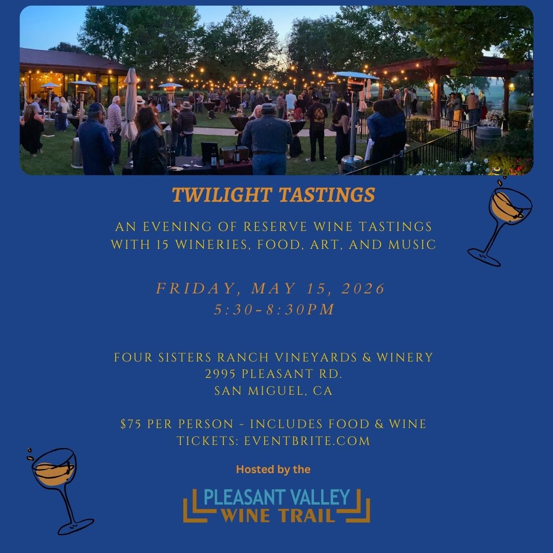 Our mission is to celebrate and steward the Pleasant Valley Wine Trail by welcoming visitors to the rolling hills of San Miguel, where they'll experience warm hospitality, handcrafted estate wines, and unforgettable vineyard landscapes. As a nonprofit alliance of family-owned wineries and farms, we work together to promote our 12-mile “off-the-beaten-path” wine trail, preserve local culture and historic landmarks, and create award-winning wine experiences that reflect the authentic character of our community. Through collaborative events, charitable giving, and a shared commitment to excellence, we invite guests to experience our wines, meet the people behind them, and fall in love with San Miguel wine country.