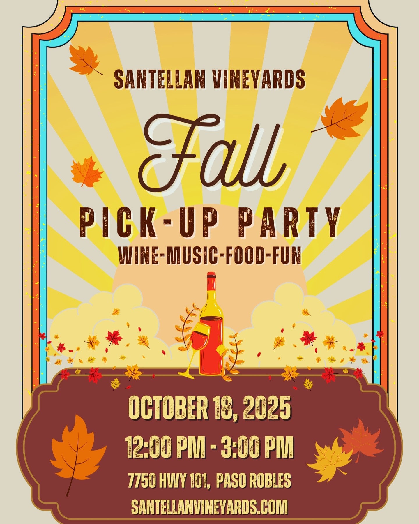 Fall 25' Pick Up Party! Members are free, guests are $35. RSVP to info@santellanvineyards.com